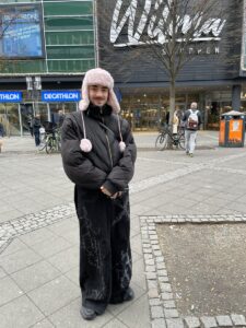 Rosa und schwarz, eine farblich gelungene Kombination, wenn man so jung ist. Zur Wintermütze – aus Shearling? Kunstfell? Fleece? – à la russische Ushanka, die schon wegen der heiteren Farbe und der Bommel ganz und gar unmilitärisch wirkt, trägt unser Protagonist eine schwarze Hose mit weitem Bein und zurückhaltender, gleichwohl glitzernder Verzierung. Eine kurze schwarze Daunenjacke komplettiert den Look, der in seiner Gesamtheit locker geräumig, aber nicht wuchtig wirkt. Die lustige Mütze verhindert eine mögliche Schwere.