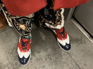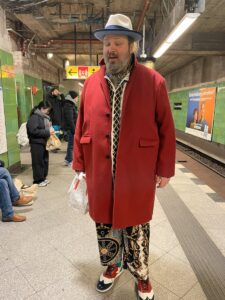 Im U-Bahnhof Bismarckstraße in Berlin-Charlottenburg traf ich einen gutgelaunten Herrn. Er nannte sich Moll. Vielleicht heißt er tatsächlich so, vielleicht ist das ein Pseudonym. Einen Mollton konnte ich in seinem Outfit nicht entdecken. Im Gegenteil, der rote Mantel, die dreifarbigen Schuhe, das lebhafte Muster von Hemd und Hose: das ist reine Dur-Tonalität. Ein wenig Retro schwingt auch mit.